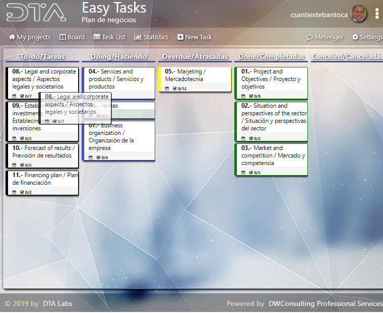 Conforme va progresando el flujo de trabajo o proyecto, las tarjetas van moviéndose de la lista de haciendo “Doing” a completadas. Si alguna tarjeta rebasa el tiempo asignado sin estar completada, es el propio EasyTask quién la envía a atrasadas “Overdue”.