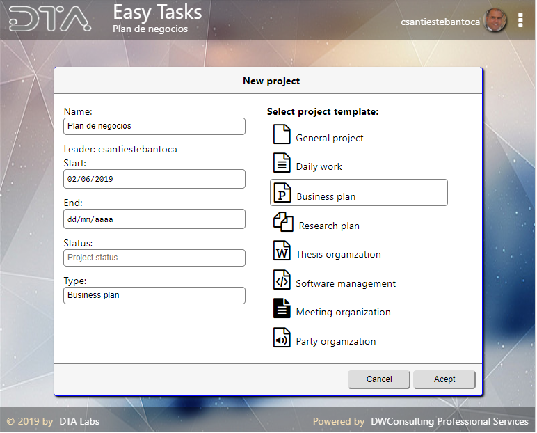 Es muy simple, solo crea un nuevo proyecto y selecciona la plantilla adecuada. En este caso sería “Business plan”, debido a que se trata de un plan de negocios. Rellena o modifica los campos necesarios y listo!